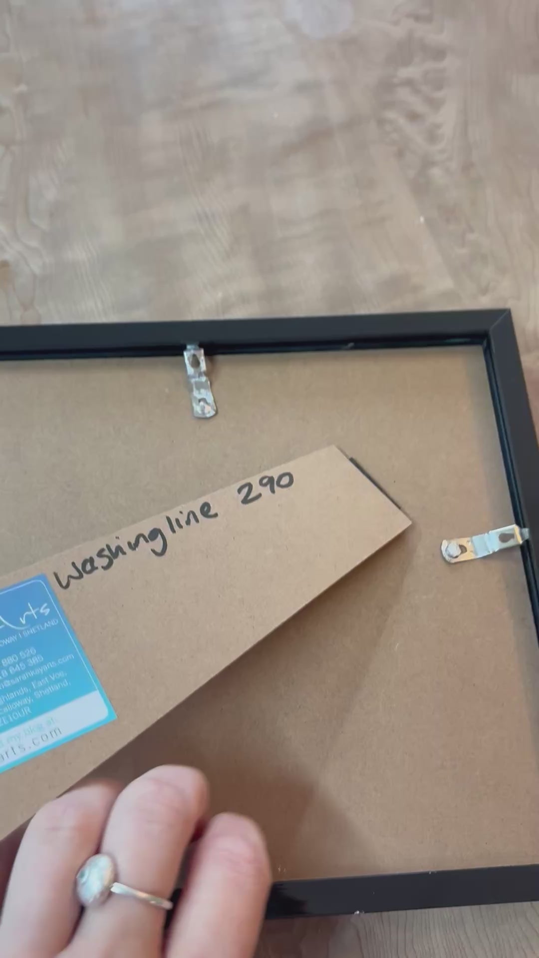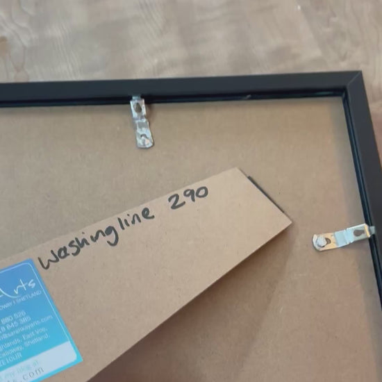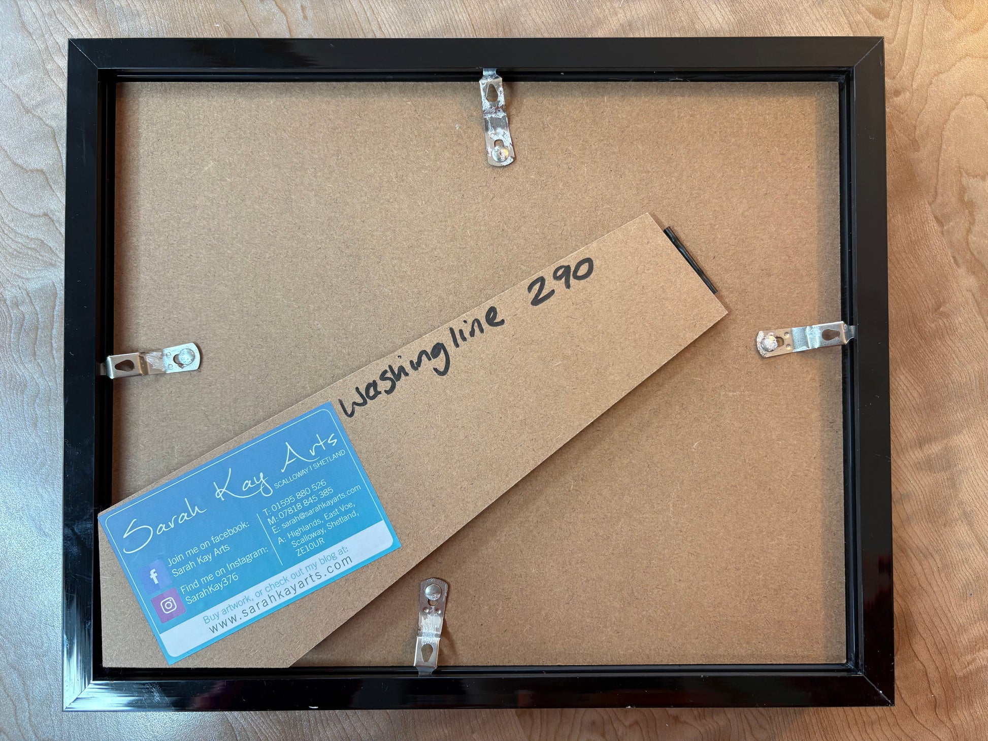 This one is framed in a black frame , ready to hang or stand up. Frame size - 8” x 10”. Each Washing line art piece is numbered on the back and has become very collectable - This one is number 290