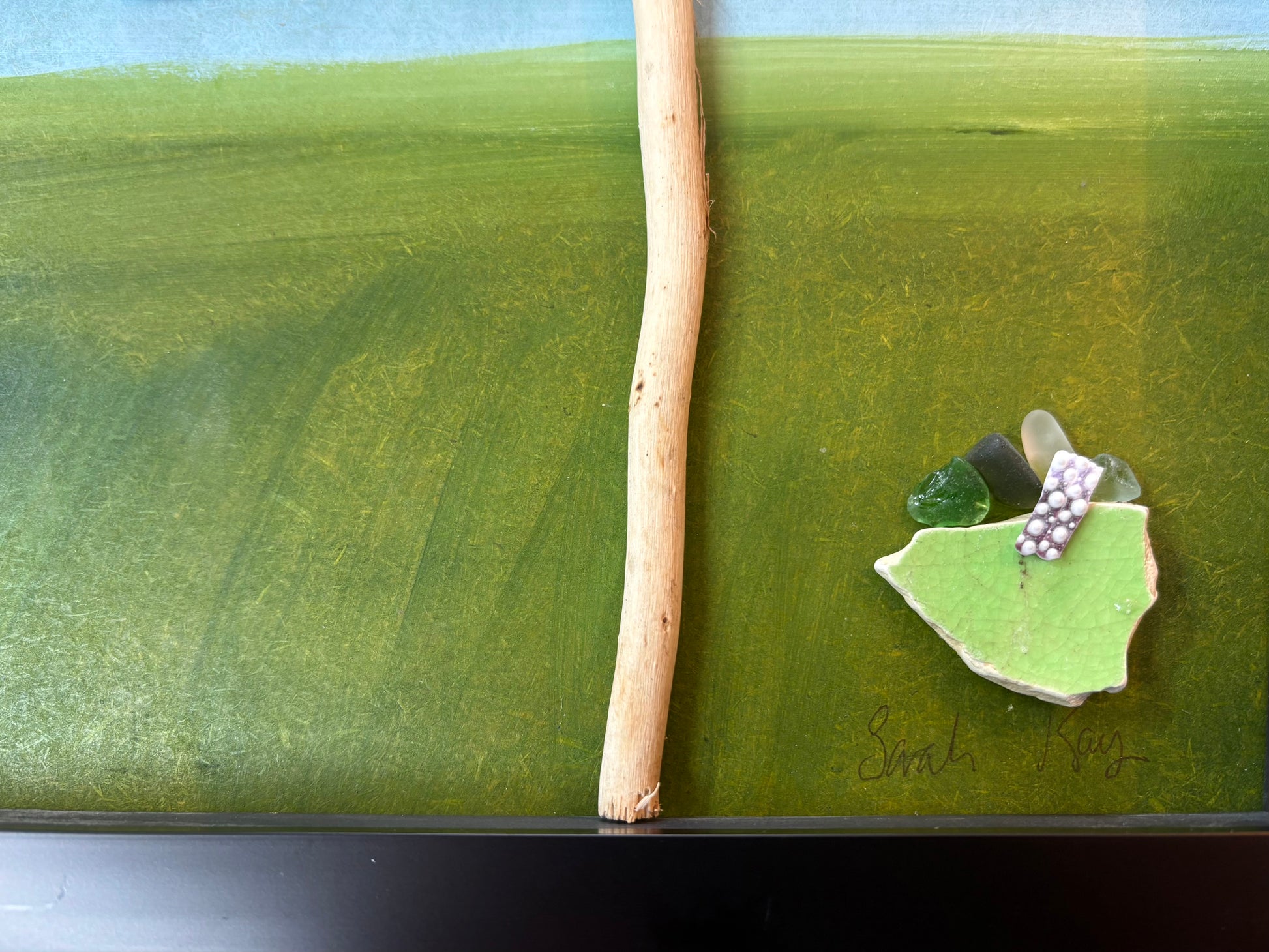 Original artwork created using Shetland beach finds - sea glass, sea pottery, driftwood sticks, necklace chain and acrylic paint. I collect all my materials from the beaches around The Shetland islands, sometimes snorkelling and picking up pieces. Each picture is unique and no two will ever be the same, the background is hand painted.