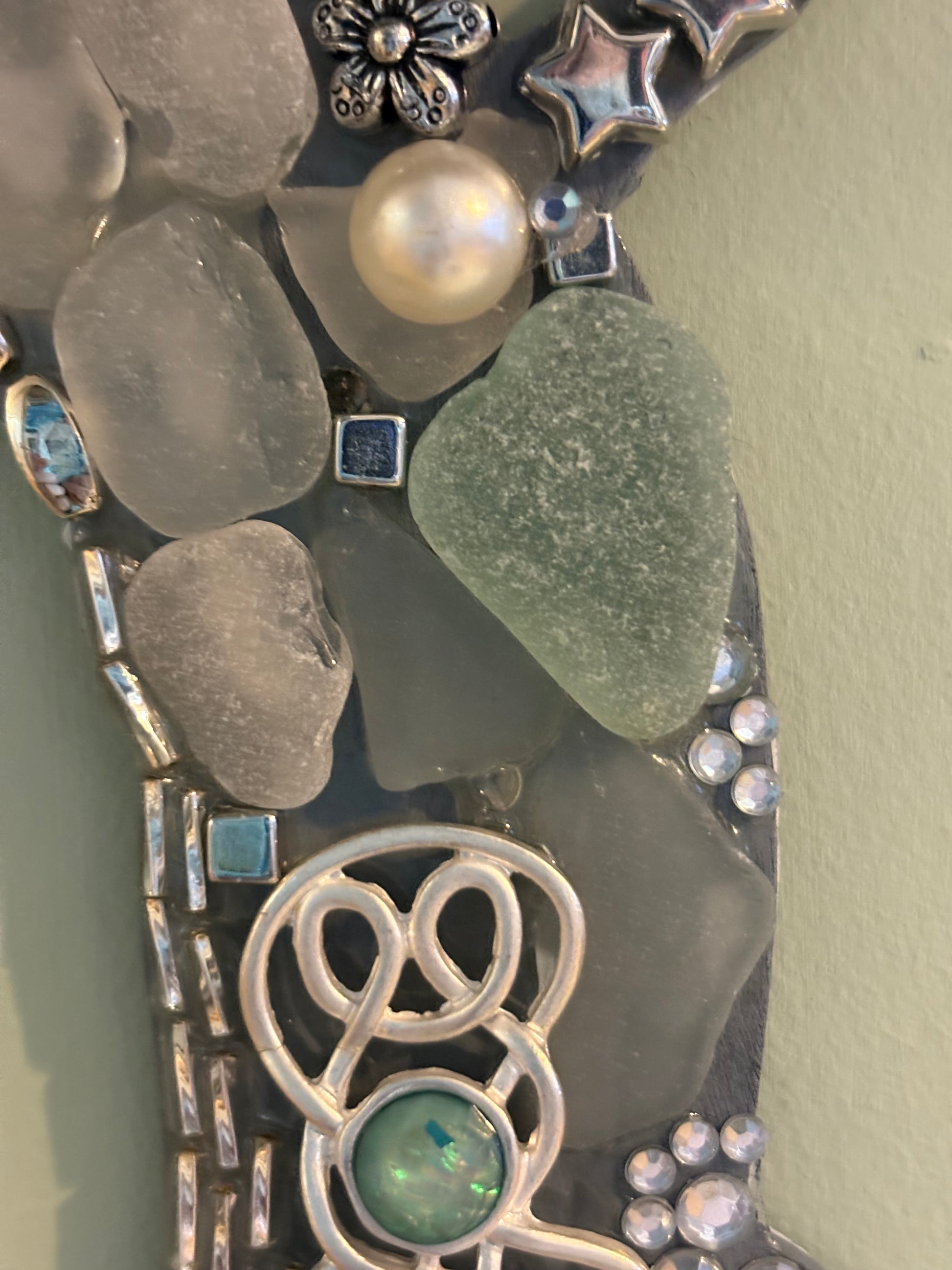 Sarah hand picks each piece of sea glass then cleans and sorts them into sizes and colours before incorporating them into her artwork.