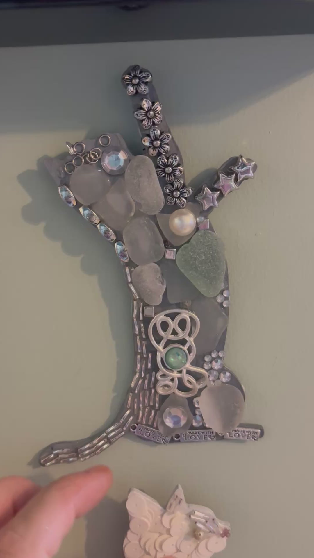 Each cat is arranged by hand so that the soft, wave-worn glass pieces nestle among tiny charms, stars, crystals and beads, forming a quirky cat silhouette that’s full of character. No two are ever the same – your cat will be completely unique.