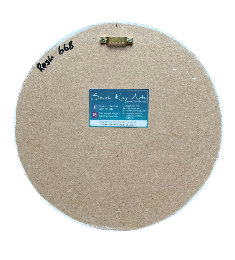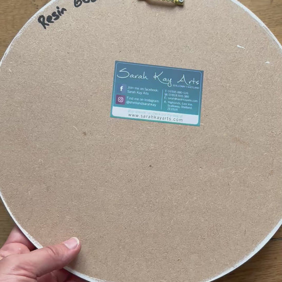 This circular resin artwork captures the raw beauty and power of the ocean in motion. Deep indigo blues merge with turquoise shallows, creating a sense of depth and movement across the piece. White waves roll and crash with delicate, foamy detail, evoking the energy of a stormy sea. Subtle layers of shimmer and translucent resin add dimension, drawing the eye into the shifting tides. Measuring 30 cm in diameter, this seascape is both a striking wall feature and a meditative window into the ever-changing mood of the sea.