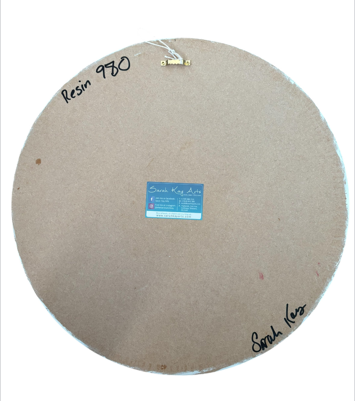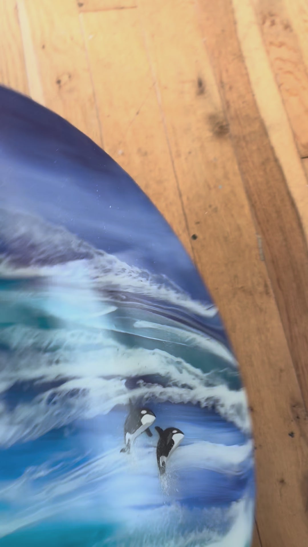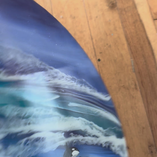 Bring the power and beauty of the ocean into your home with this striking 50 cm round resin seascape. Layers of deep indigo, turquoise, and foaming white waves capture the movement of the sea, while a pod of graceful orcas leaps through the surf.