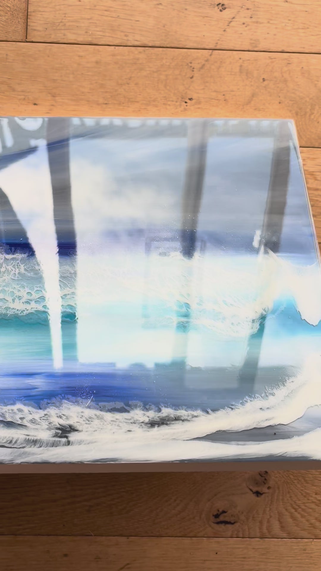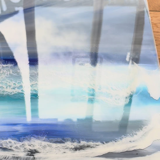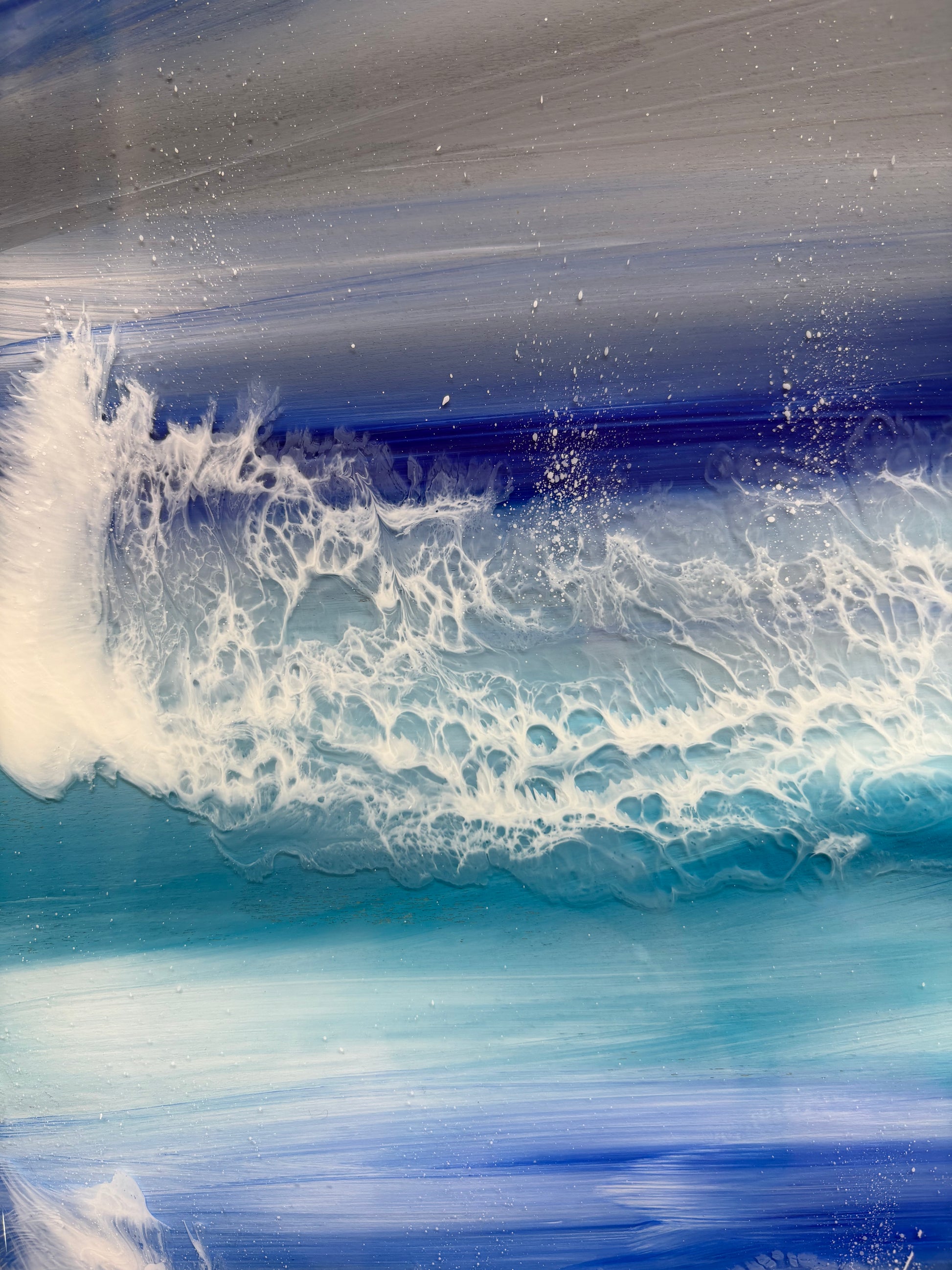 Using layers of tinted resin and delicate wave effects, the piece evokes the movement of tides and the serenity of a quiet beach. This piece is ready to hang and makes a stunning addition to any space.