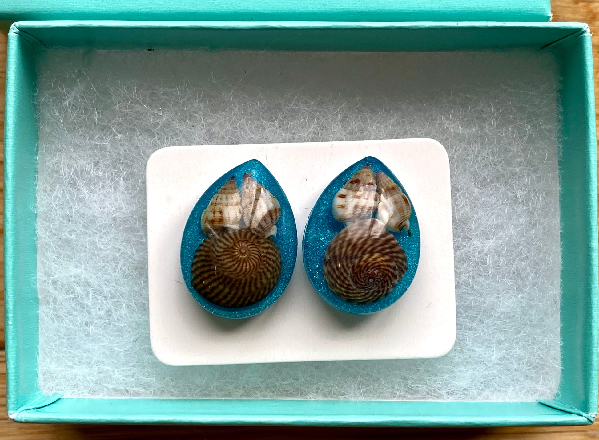 Original chunky studs made by Sarah. Beautiful tiny shells collected from beaches around The Shetland islands, preserved in resin for you to treasure.