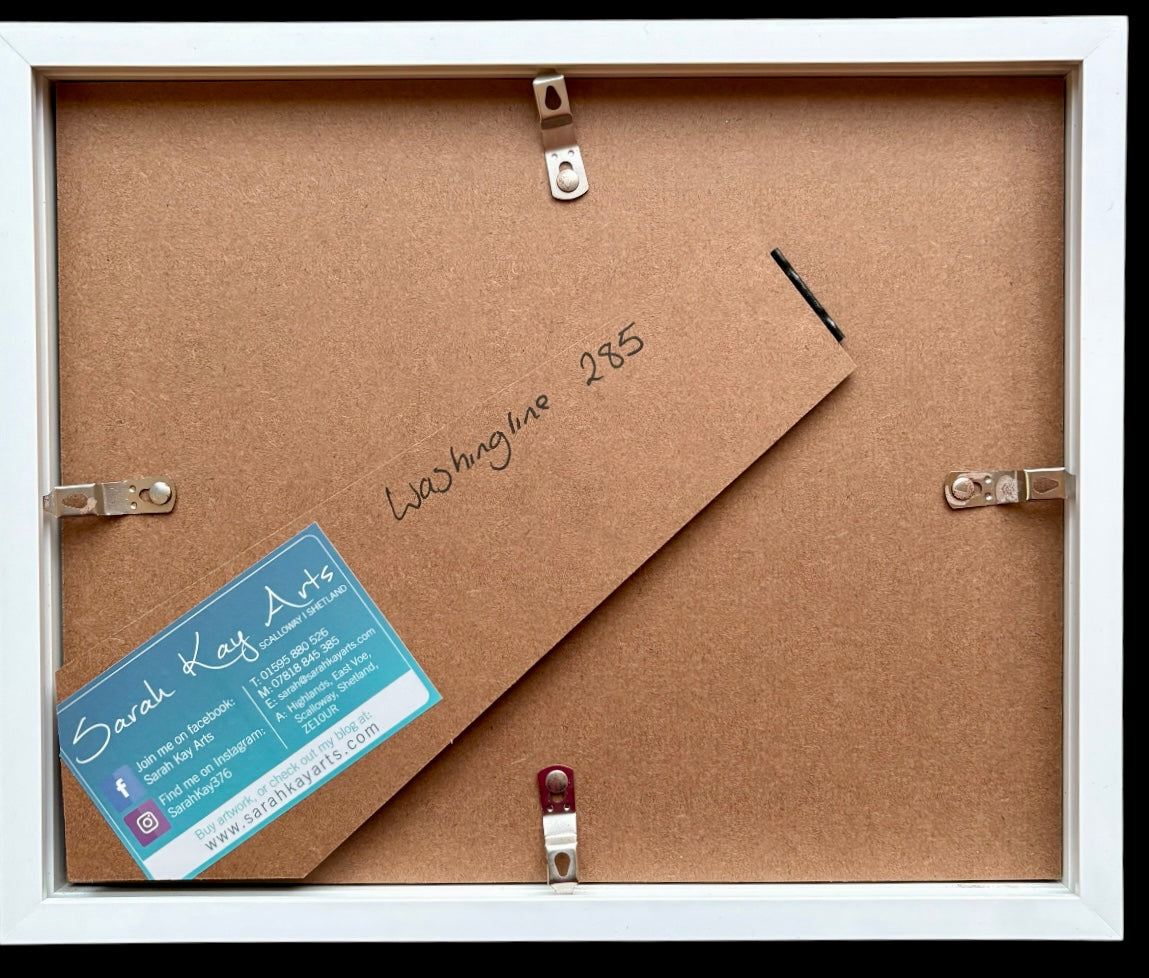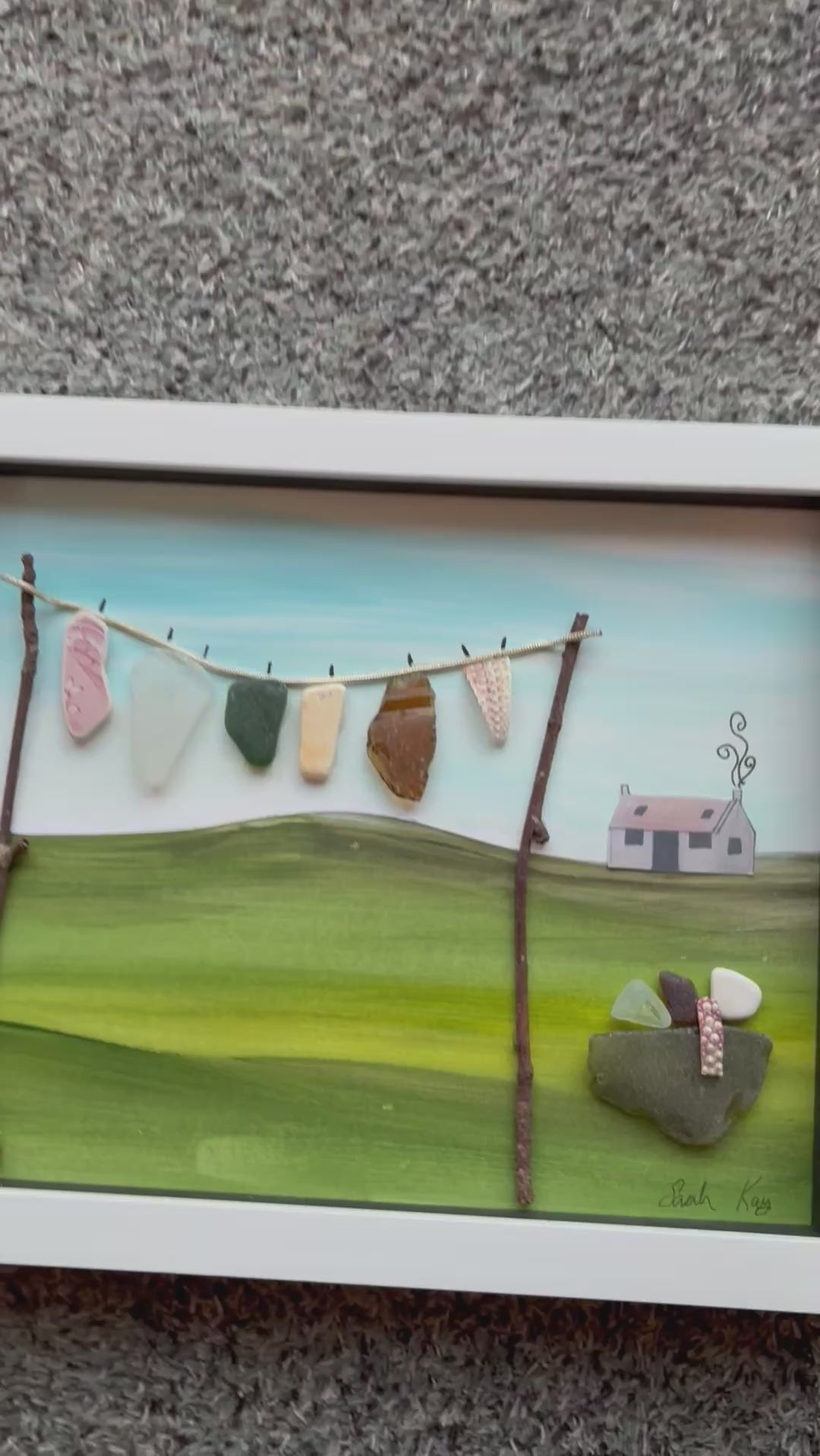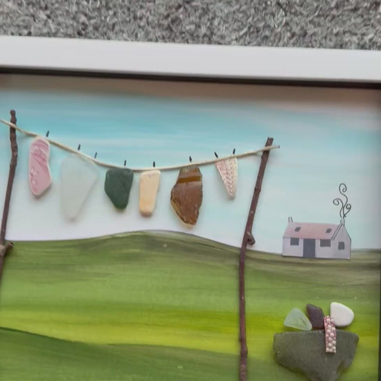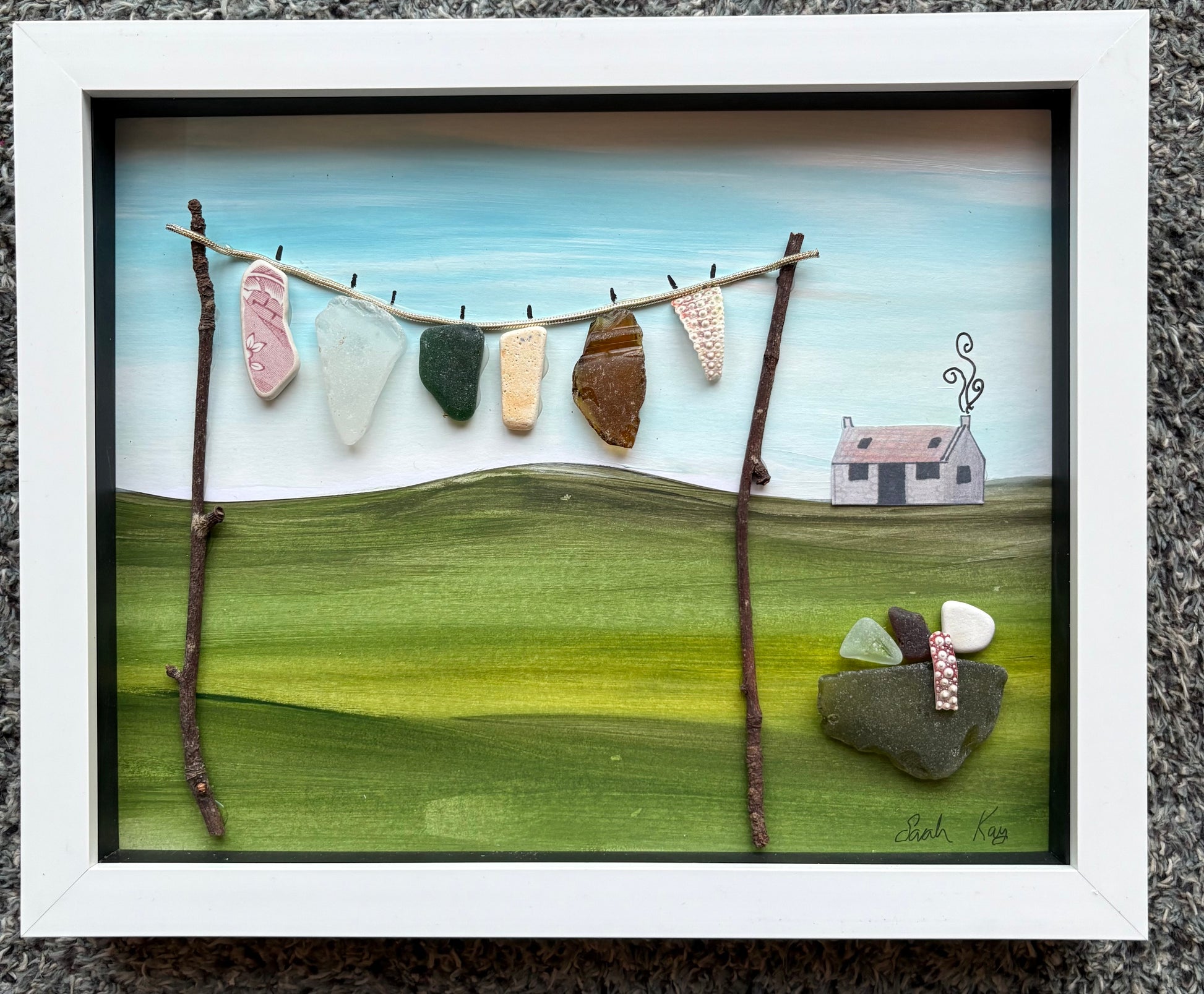 Bring a touch of Shetland charm into your home with this unique mixed-media artwork by Sarah Kay Arts. Handcrafted using locally found sea glass, pottery, driftwood, and natural beach treasures, this piece captures a peaceful moment in island life: a colourful washing line dancing in the breeze, set against rolling green hills and a cosy croft house in the distance.