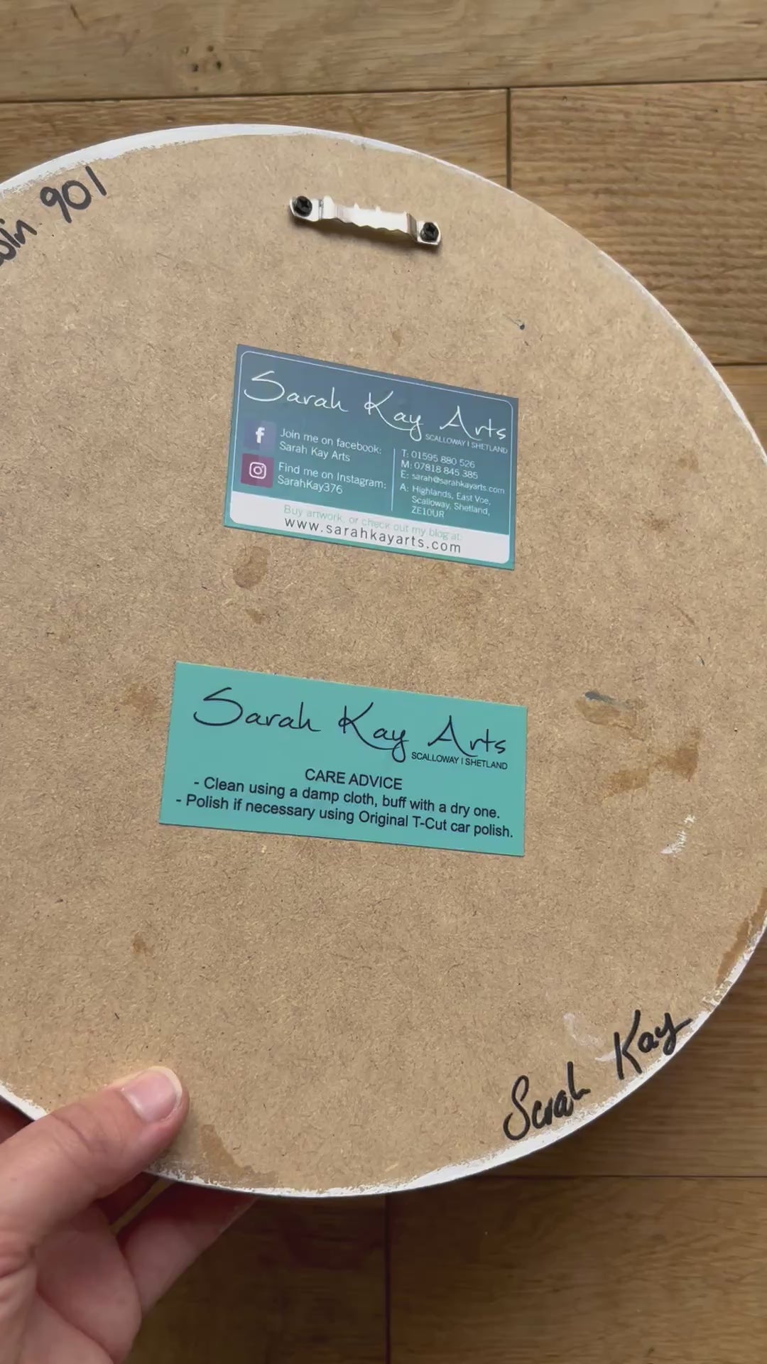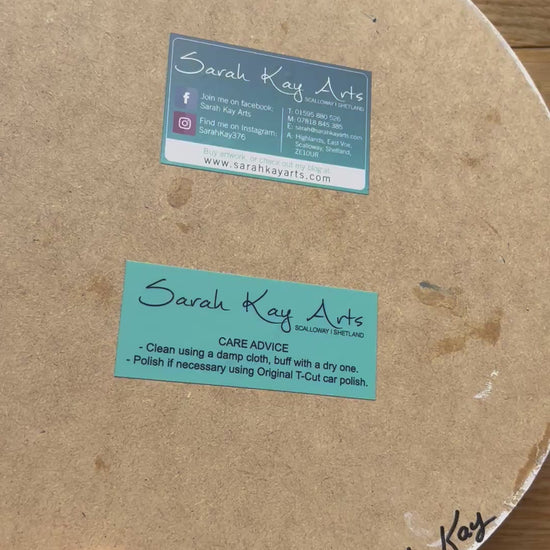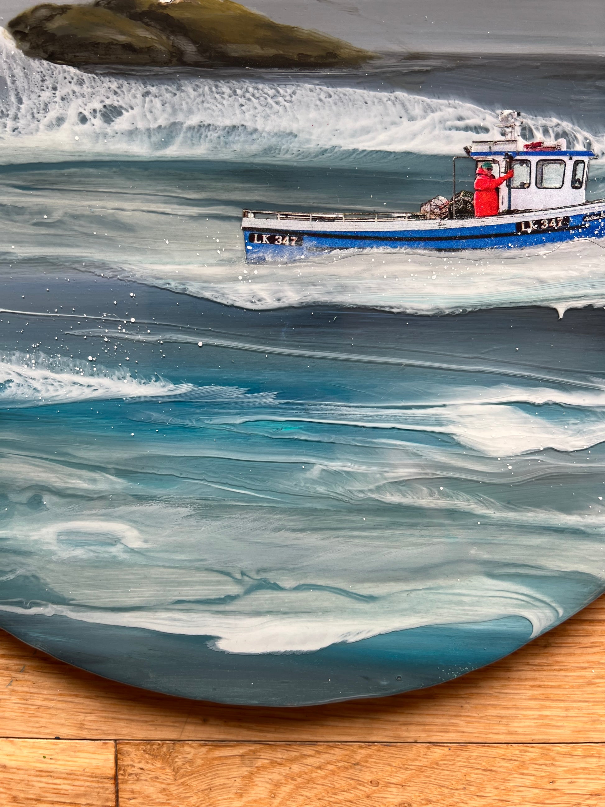 This circular seascape captures the drama and beauty of Shetland’s coast. A local fishing boat, in vivid blue with its registration LK 342, navigates the rolling waves with resilience and purpose. Behind, the iconic Skerries lighthouse stands tall against a moody grey sky, a steadfast guardian of the seas. The dynamic brushwork and resin-like depth in the water create a sense of movement and energy, with waves curling and foaming around the vessel. Measuring 30 cm across, this piece is both a celebration of Shetland’s fishing heritage and a tribute to the enduring power of sea and light.